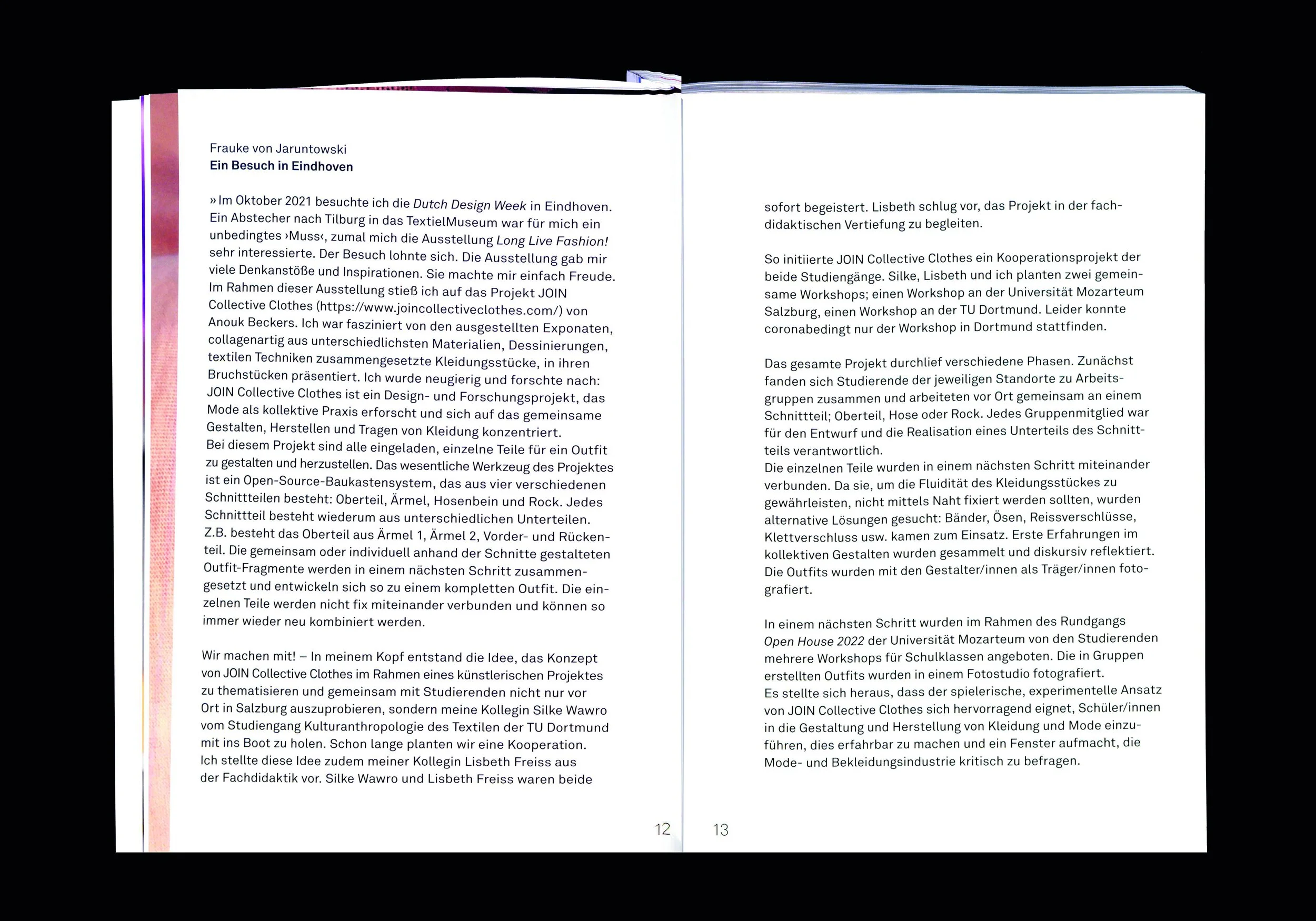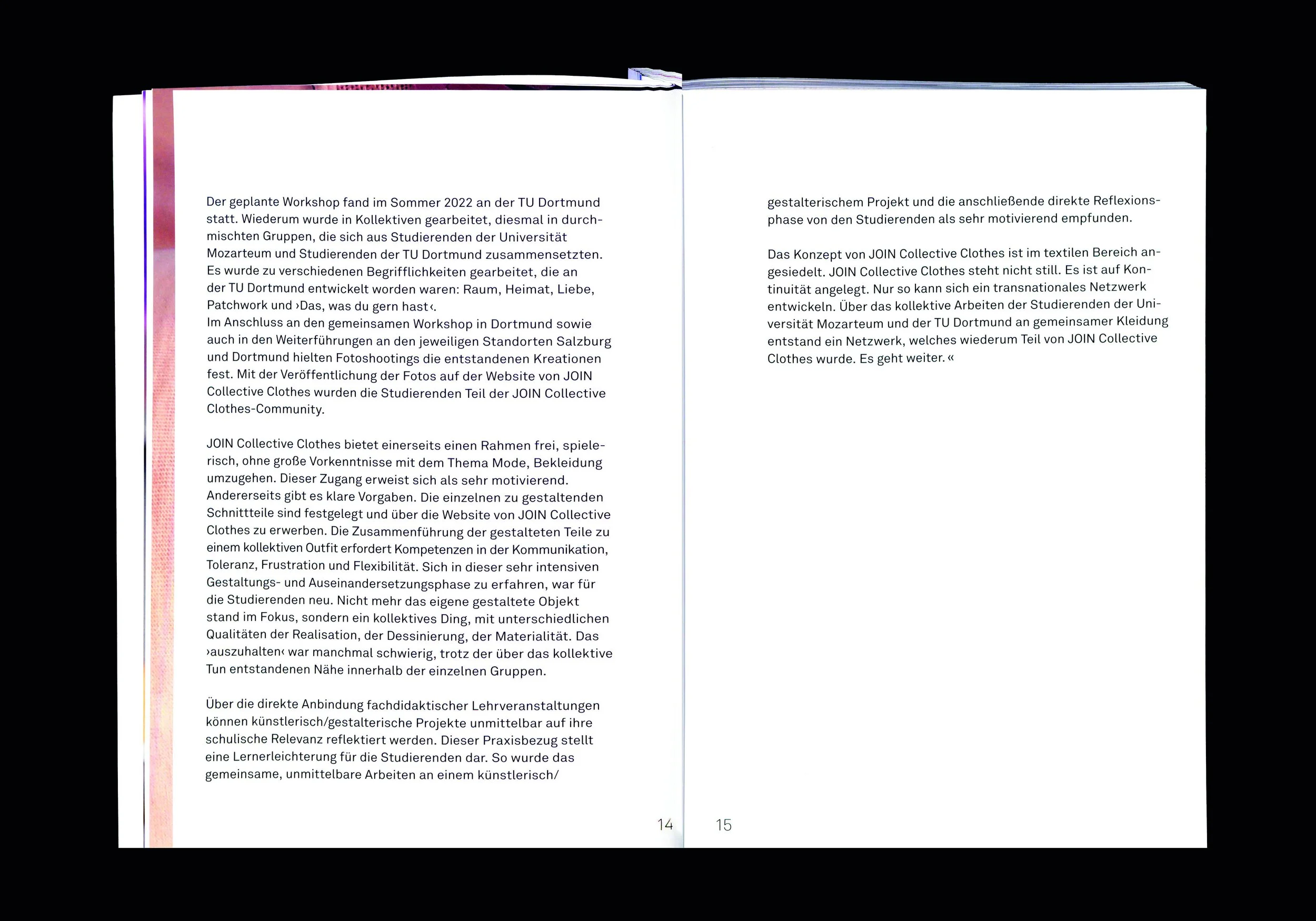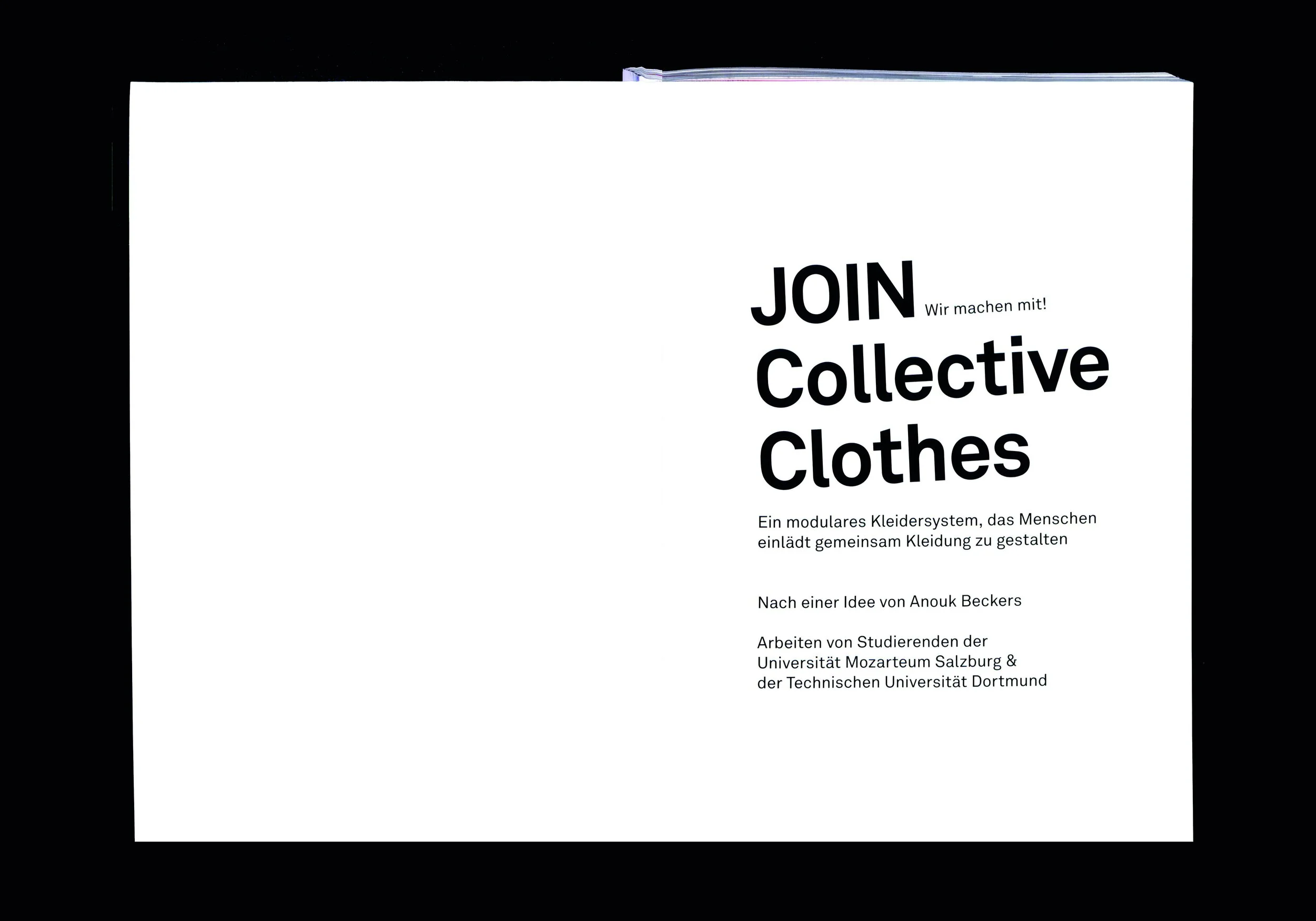 Der Workshop JOIN Collective Clothes war eine Kooperation von Studierenden des Unterrichtsfaches Gestaltung: Technik.Textil der Universität Mozarteum Salzburg und des Lehrbereichs Gestalten am Seminar für Kulturanthropologie des Textilen an der Technischen Universität Dortmund.Das gemeinsame Projekt bezog sich auf ein modulares Kleidungssystem der niederländischen Design-Gruppe JOIN Collective Clothes, die sich unter anderem im TextielMuseum in Tilburg präsentierte. Die Gründerin Anouk Beckers entwickelte ein Open-Source-Schnittmuster, das aus vier verschiedenen Vorlagen besteht und die zusammen ein komplettes Outfit ergeben.Studierende begannen mit ersten Versuchen in den Werkstätten ihrer eigenen Universitäten, unterstützt von ihren Seminarleiterinnen Frauke von Jaruntowski und Lisbeth Freiss in Salzburg und Silke Wawro in Dortmund. Nach Versuchen und Experimenten mit dem Schnittmuster in Form von Papier und Textil trafen sich beide Gruppen zu einem eintägigen Workshop in Dortmund. Die Studierenden entschieden sich in kleinen Gruppen zusammen zu arbeiten mit dem Ziel, gemeinsam ein Kleidungsstück zu gestalten: ein Shirt, einen Pullover, ein Kleid, eine Hose oder einen Rock. Nach Abschluss des Workshops setzten die Studierenden ihre Arbeiten an ihren jeweiligen Standorten fort und realisierten ein Outfit für die JOIN Collective Clothes Collection. Die entstandenen Kleidungsstücke wurden für ein Foto-Shooting in einem Salzburger Einkaufszentrum und in der Innenstadt von Dortmund getragen. Die Ergebnisse präsentieren kreative Interaktionen von textilen Materialien und Techniken und stellen zugleich Fragen zu der Funktion und den Werten von Kleidung und werden in der Publikation