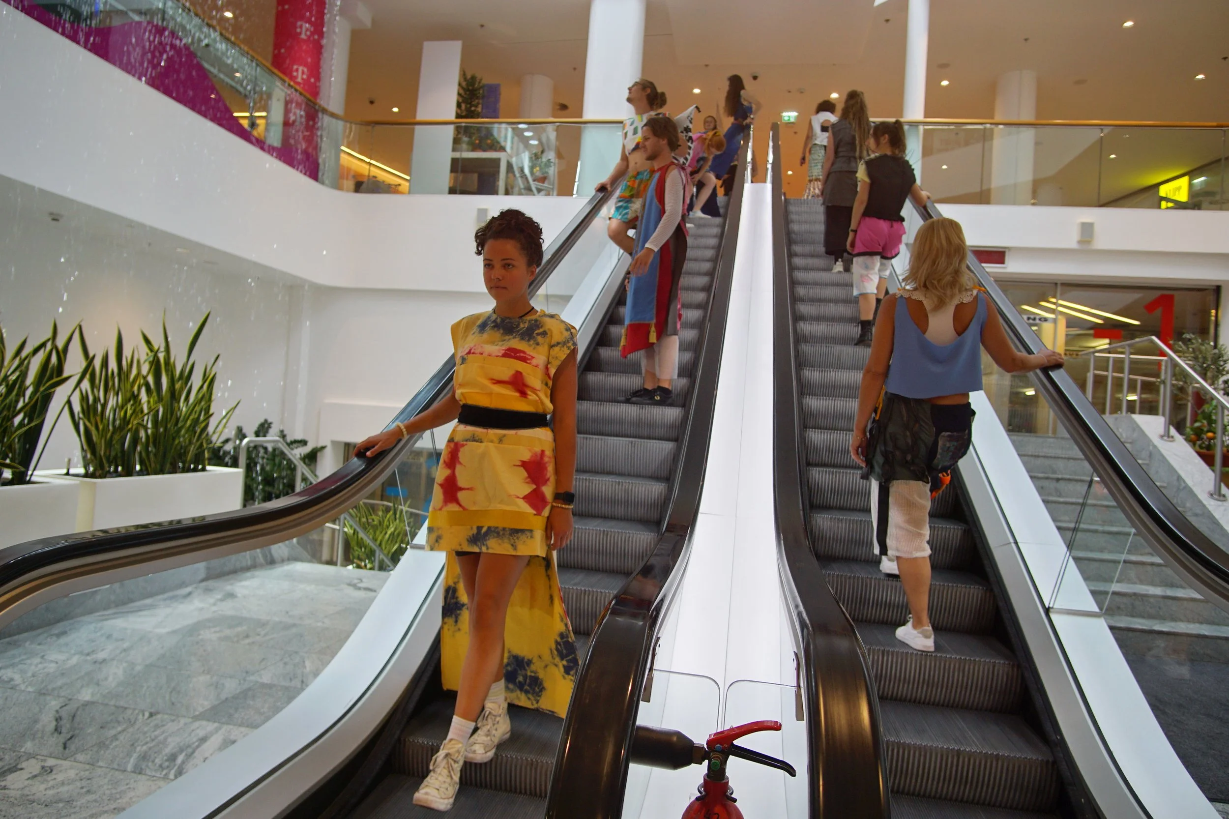 The finished garments were worn for a photo shooting in a shopping center in Salzburg and in downtown Dortmund.